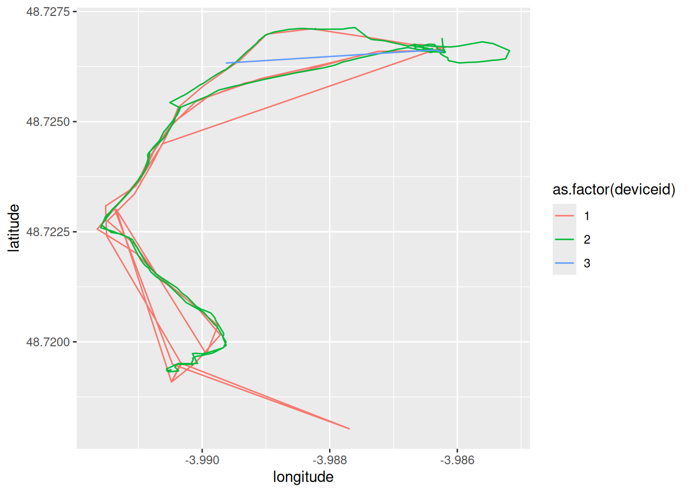 |> select(id, deviceid, devicetime, latitude,longitude) |> ggplot() +aes(x=longitude, y = latitude, col = as.factor(deviceid)) + geom_path() positions