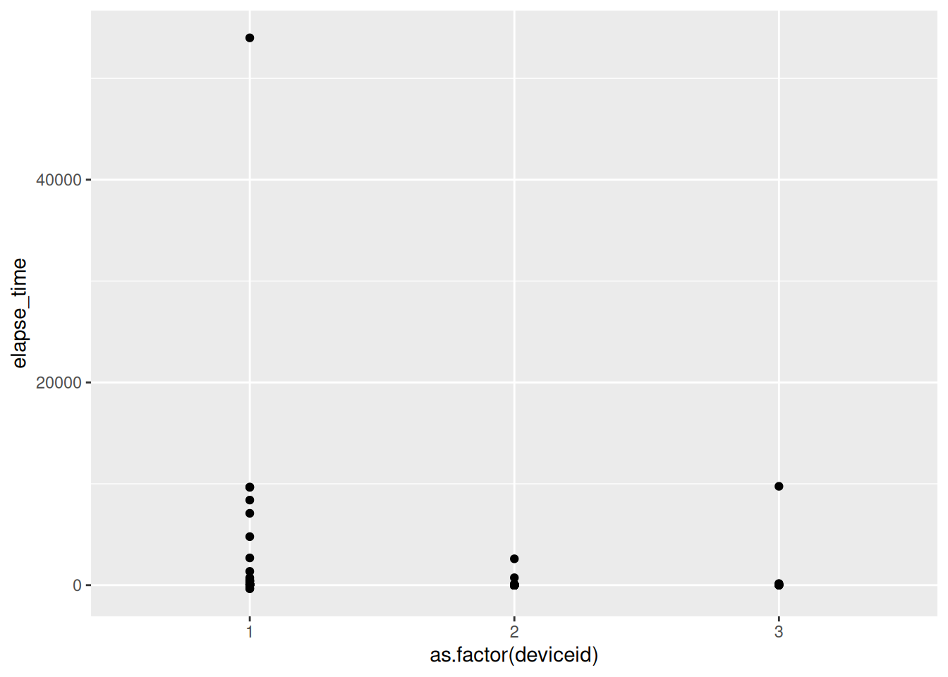 ggplot() + aes(x=as.factor(deviceid), y = elapse_time) + geom_point()
